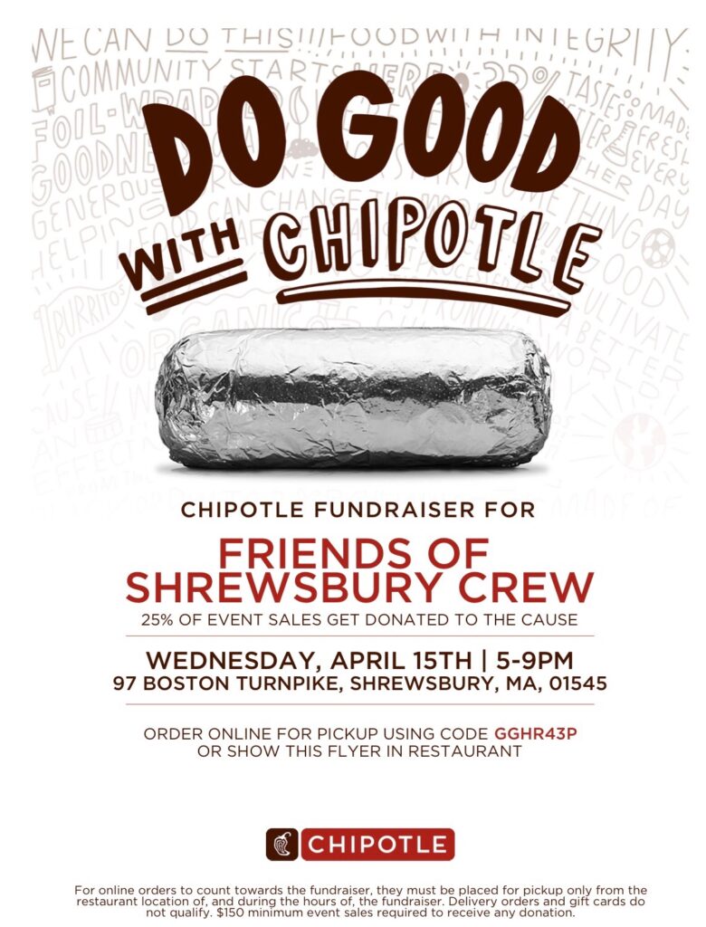 The Spring 2026 rowing season is here, and after only one weekend of races, we’re already hosting our first “dine-in” fundraiser of the season! Please consider letting Chipotle in Shrewsbury prepare dinner for you and your family on Wednesday 4/15.